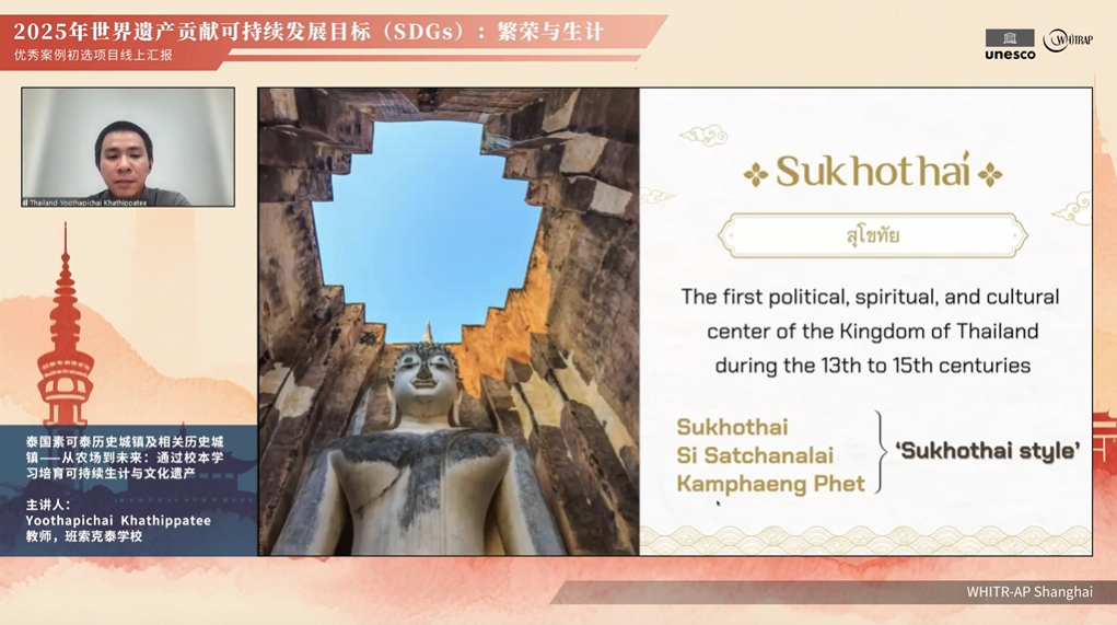 On June 7, 2025, the online presentation for the preliminary selection of outstanding cases for World Heritage Dialogue: 2025 World Heritage Contribution to Sustainable Development Goals: Prosperity and Livelihood was successfully convened. This event was organized by the UNESCO WHITR-AP Shanghai, with the participation of eight expert judges, including WHITR-AP Shanghai Special Advisor Gamini Wijesuriya, WHITR-AP Shanghai Director Shao Yong, SEAMEO SPAFA Senior Specialist in Cultural Heritage Conservation Hatthaya SIRIPHATTHANAKUN, ICCROM Project Manager Rohit JIGYASU, Emeritus Professor of World Heritage Studies at the Graduate School of Comprehensive Human Sciences, University of Tsukuba Nobuko INABA, Deputy Director Wang Xinyuan of the International Centre on Space Technologies for Natural and Cultural Heritage(Hist) under the auspices of UNESCO, and WHITR-AP Shanghai Research Director Carolina CASTELLANOS. Representatives from 18 heritage sites across nine countries (Yemen, China, Thailand, Iran, Nigeria, Oman, Kenya, Vietnam, and Egypt) presented their respective cases. A total of 28 HeritAP members participated in the Zoom meeting, with the live broadcast attracting about 3,100 viewers.