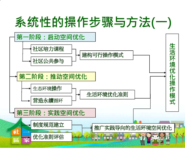 社区的生活:以上的认识可以理解为重新寻找人与环境之间的连接,这个过程是一个制造的过程也是一个参与式的过程,不仅是规划者要参与居民的生活中,居民也或参与构建到美好的社区生活愿景中。这个过程通常分为三个阶段,第一阶段:启动一些培力的课程,强调公共参与,建构一个可操作的模式;第二阶段:让这个可操作的模式进入到更理的并与生态相连接,跟环境的永续的循环相结合,进而形成一个所谓的优化的准则;第三阶段:利用这个准则去影响制度规范的建立,并进行评估,确保整个实践的可能性。