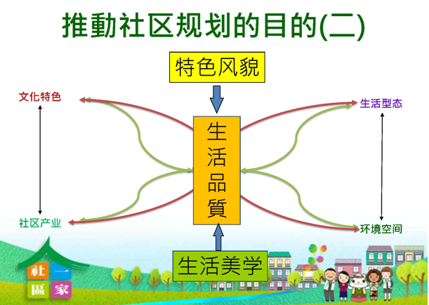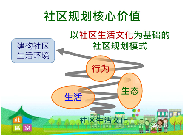 在这个过程中有几个核心价值,比如人们的生活形态、环境空间、社区产业和文化等,这些共同影响和推动社区生活品质的提升,有助于我们的社区在未来形成特色风貌。