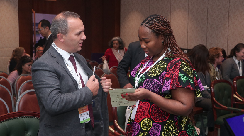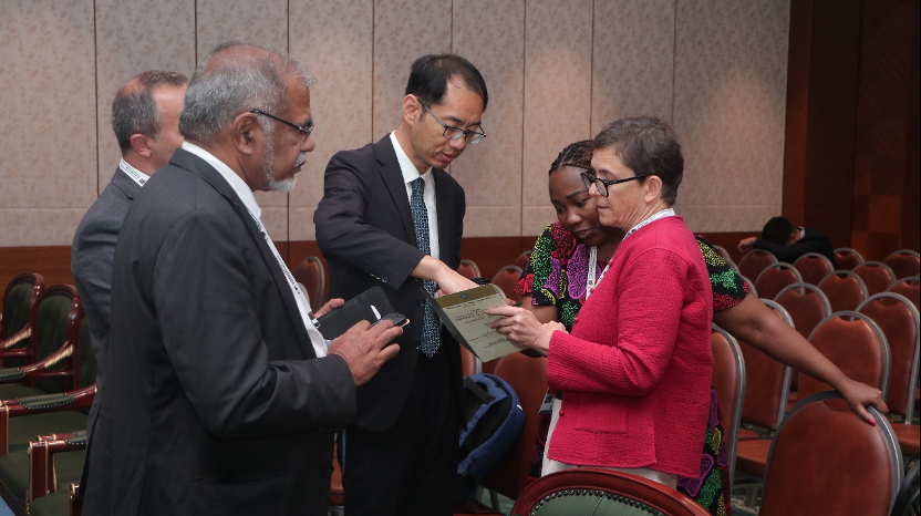 非洲世界遗产基金会伙伴关系负责人Veronica Maduna女士为Mak'TAB——建筑遗产修复创新学园(阿塞拜疆)获奖者代表Mr. Elsevar Mammadov现场颁发探索之星奖。