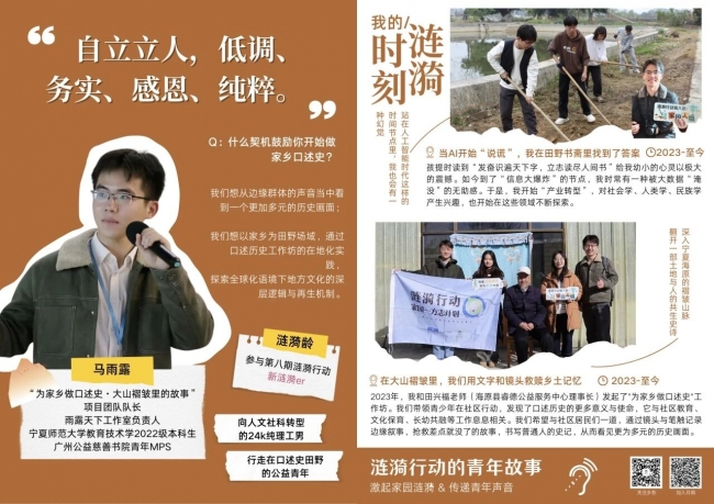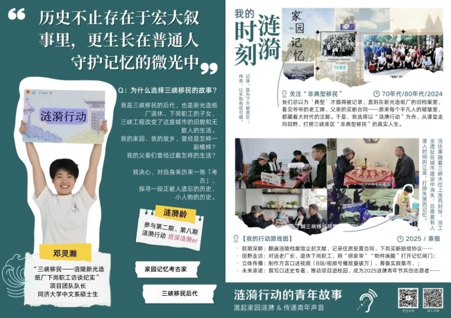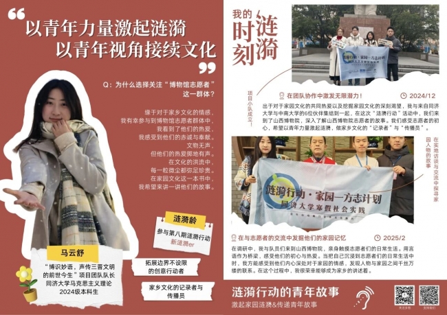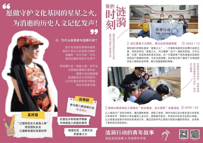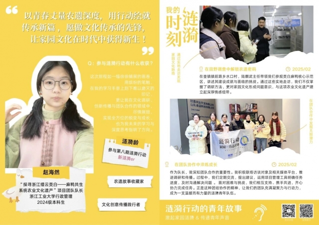 在本期行动中,还涌现出一批具有深度洞察力与持续行动力的涟漪青年。他们不仅是家园故事的记录者,更是文化传承的创变者——有人以口述史打捞即将消逝的工业记忆,有人以设计活化古老非遗,有人在农业遗产地探索“青年方案”,也有人将博物馆志愿者的声音传向远方。