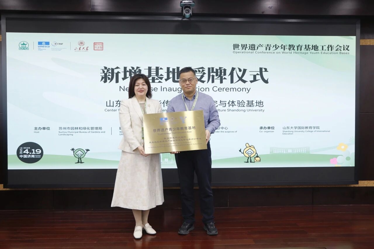会议当天,由教育部中外语言交流合作中心与山东大学共同建设的山东大学中华传统文化研究与体验基地正式获得“世界遗产青少年教育基地”授牌,成为亚太地区遗产青少年教育网络的重要一员。