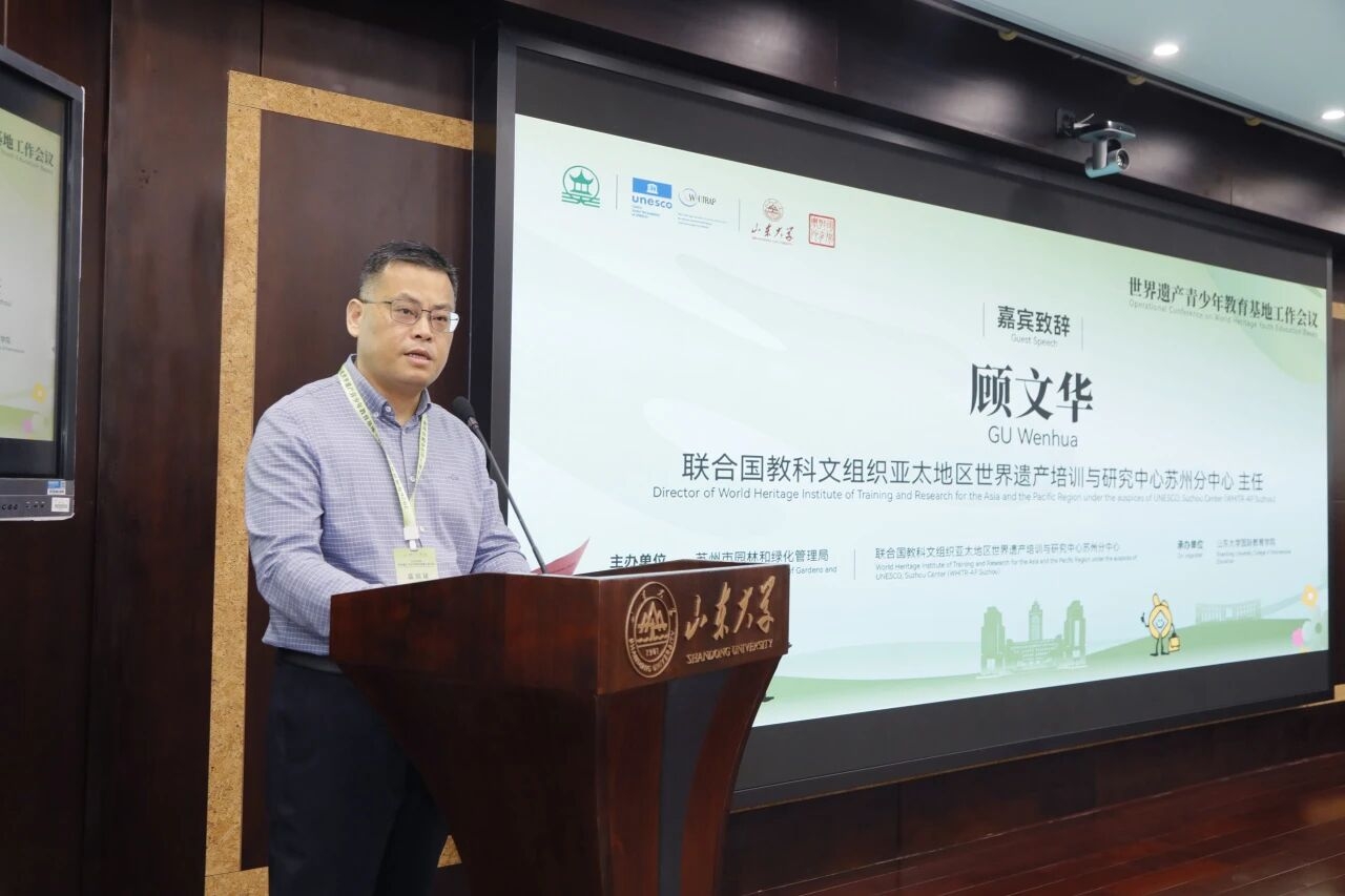 本次会议由苏州市园林和绿化管理局、联合国教科文组织亚太地区世界遗产培训与研究中心苏州分中心(以下简称“亚太遗产中心苏州分中心”)联合主办,山东大学国际教育学院承办。 ![]() 亚太遗产中心苏州分中心主任顾文华致辞