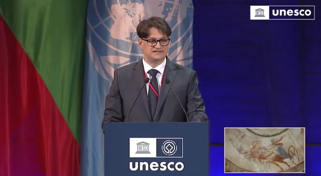 保加利亚文化部长马里安·巴切夫也发表了主旨演讲,阐述全球遗产保护工作有两大当务之急。